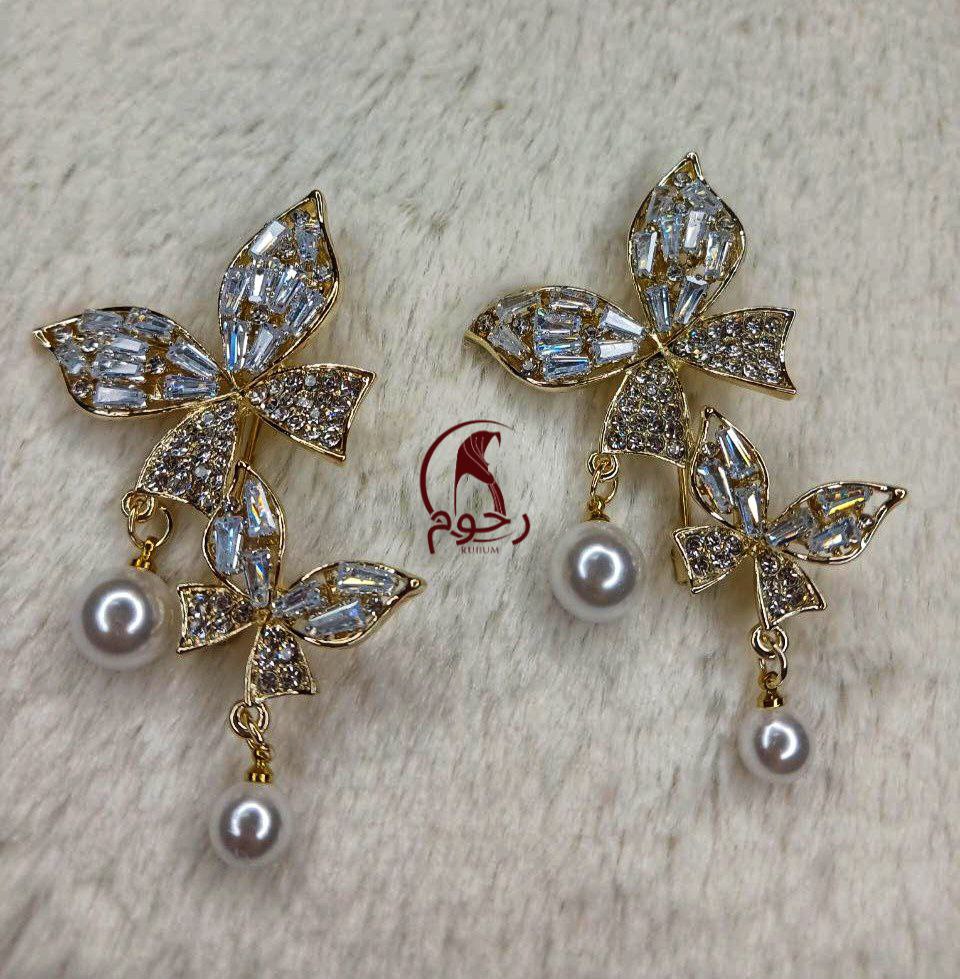 “Crystal Butterfly & Pearl Dangle Brooch Set.”