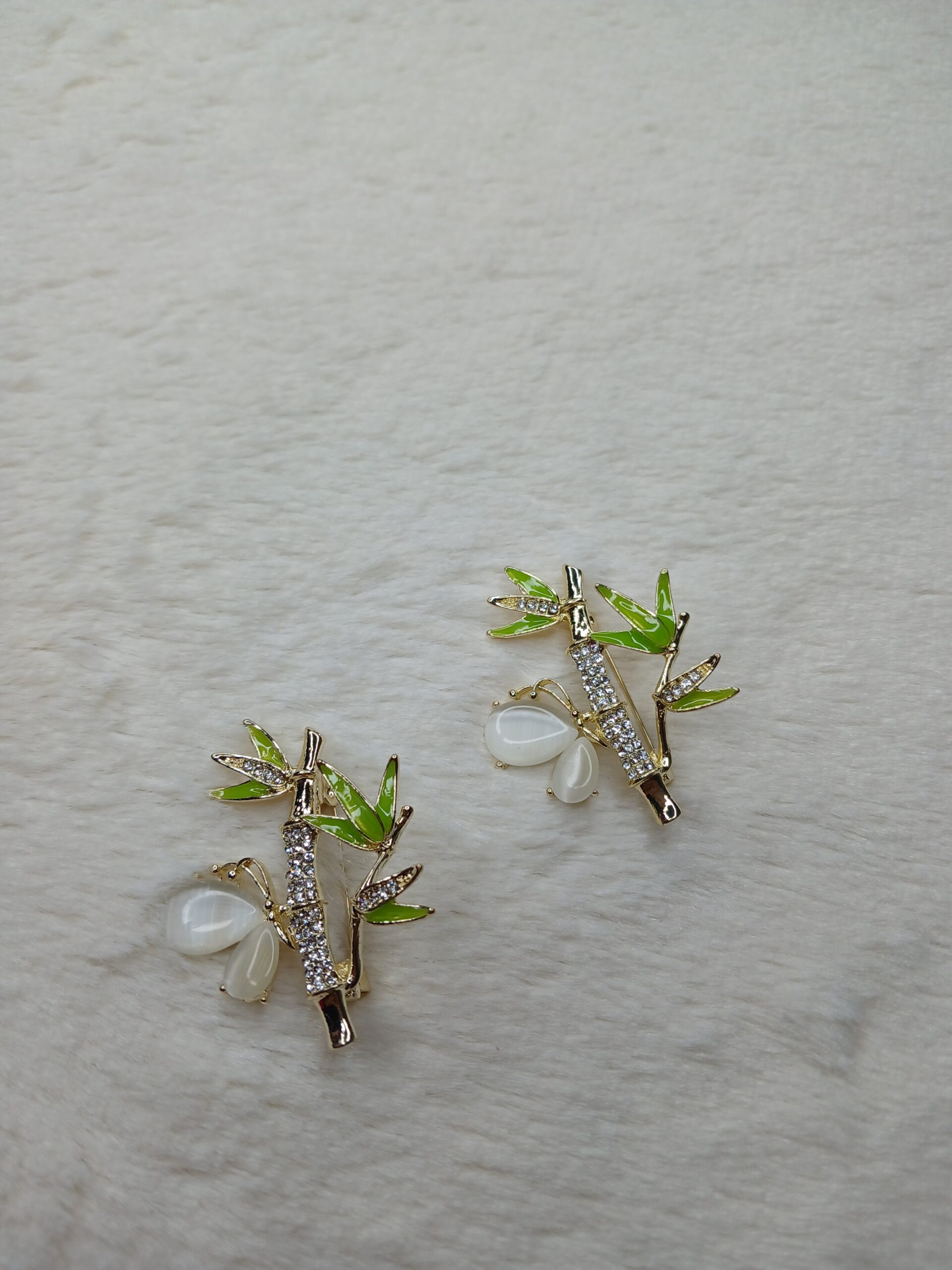 A pair of elegant, matching brooches featuring a bamboo stalk motif crafted in gold-tone metal. The stalks are adorned with clear, sparkling rhinestones, and the leaves are enameled in a vibrant, light green. At the base of the stalks are three teardrop-shaped opalescent white stones that resemble dew or raindrops.